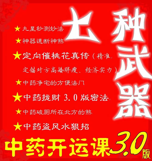 中药化解太岁、中药强效催财、中药催桃花、中药催贵人、中药驱邪……中药开运课,传的不只是易术,更是搞钱术!可谓是一学就会,一用就来钱的易术,可自用,也可帮客户。
